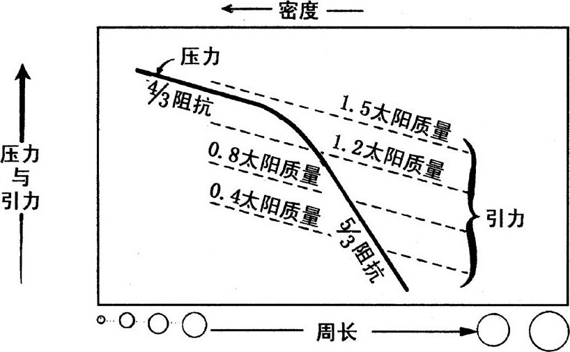 为了定量地认识为什么白矮星有如图4.3所示的质量和周长,我们来看下面的图。它表示了作为星体周长(画在右边)和密度(画在左边)的函数的白矮星内部的平均压力和引力(画在上边)。如果星体被压缩,那么它的密度会增加,周长会减小(图中向左运动),星体压力将沿实线上升,在压缩阻抗为5/3的低密度上升较陡,在阻抗为4/3的高密度上升较缓。同样的星体压缩还导致星体表面向中心运动,从而沿虚线增大了星体内部引力的强度。引力的增长率类似于4/3的阻抗:每1个百分点的压缩对应着4/3个百分点的引力强度的增加。图中画出了几条引力虚线,每条线对应一个星体质量,因为星体质量越大,它的引力越强。