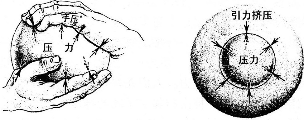 在爱丁顿的书里,钱德拉塞卡还看到了星体(如太阳和天狼B)的内部结构是如何靠内部压力与引力的平衡来维持的。压缩与膨胀的平衡,可以通过一个类比来理解(虽然这不是爱丁顿的方法):挤压你手中的气球(图4.2左),你双手向内挤压的力正好被气球空气向外的压力所平衡——空气压力是由气球内部的空气分子撞击气球的橡皮壁而产生的。