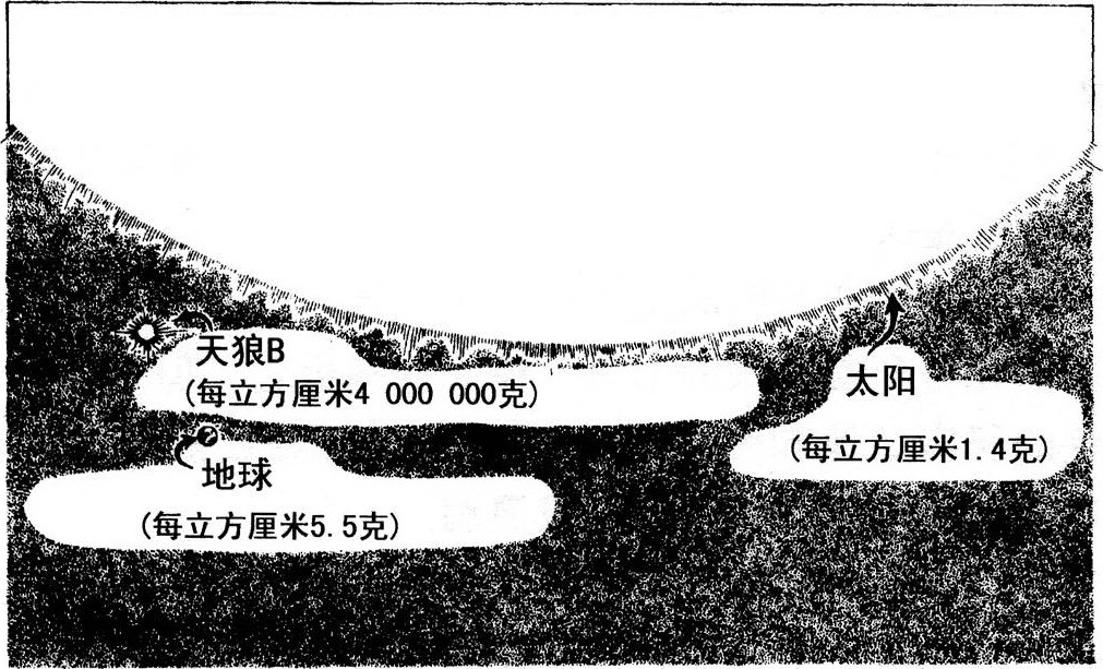 爱丁顿讲了天文学家如何根据望远镜的观测来估计天狼B的质量和周长。它的质量是0.85个太阳质量,周长是118 000千米。这意味着天狼B的平均密度为每立方厘米61 000克——水密度的61 000倍,大约正好每立方英寸1吨。“这个方法我们已经知道好多年了,我想很多人都想过,加上‘这个荒谬的’结论也是恰当的。”大多数天文学家不可能认真地看待一个比在地球上所遇到的大那么多的密度——假如他们知道更多的现代天文观测所揭示的那些事实(1.05个太阳质量,31 000千米的周长,每立方厘米400万克或每立方英寸60吨的密度),他们会认为更荒谬。见图4.1。