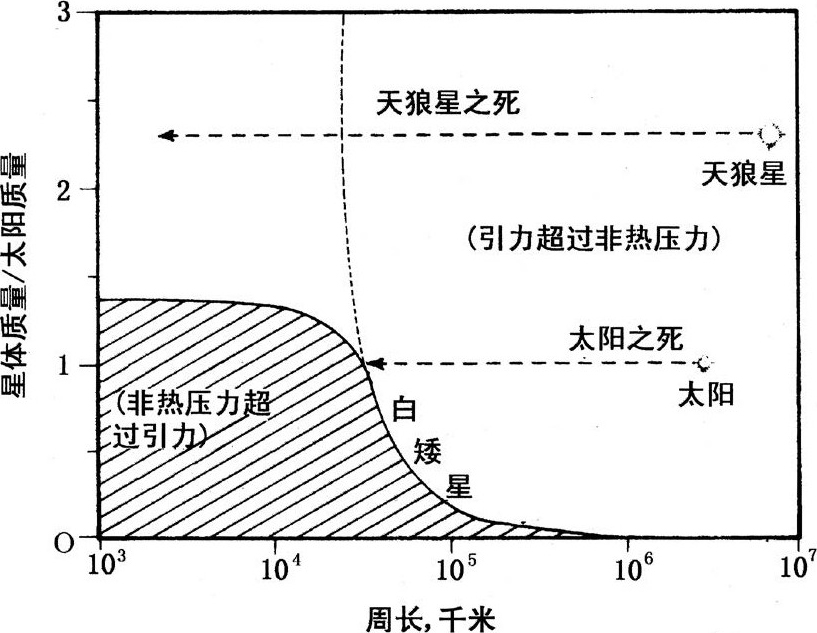 在钱德拉塞卡以水平方向画星体周长、垂直方向画星体质量的图中(图4.4),只有在一组质量和周长条件下,引力能被非热压力(星体冷却后仍然存在的压力)所平衡:这就是白矮星。在钱德拉塞卡白矮星曲线的左边区域(阴影区,小周长星体),星体的非热简并压力完全超过了引力。简并压力将使区域内的任何星体发生爆炸。在白矮星曲线右边的区域(白区,较大周长的星体),引力完全超过了星体的简并压力。任何一颗处在这个区域的冷星都将在引力挤压下立刻发生坍缩。