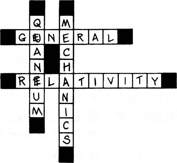 他可能看到些什么呢?从50年代起,在惠勒看来,未来最有希望的莫过于广义相对论(宏观领域)和量子力学(微观领域)的交流,那时两者还没有逻辑一致地融和起来。起初尝试解决这个问题时,它们就像一个纵横字谜。你可以试着用一组词横填,用另一组词纵填。你会发现纵横交叉处出现了矛盾:横的那行GENERAL需要E,而纵的那列QUANTUM需要U;横的RELATIVITY要E,而纵的QUANTUM要T。看看这些行列,就会明白,要么改一个字,要么两个都改,才会没有矛盾。类似地,对广义相对论和量子力学,为了从逻辑上将两者融和起来,显然应该修改其中的一个,或者两个都要修改。如果这种融和实现了,那么广义相对论与量子力学的最终统一将产生一组新的强有力的定律,物理学家称它为量子引力。不过,50年代的物理学家对两者结合的认识还太简单,尽管费力不少,但进展不多。