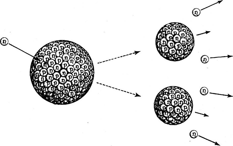 很重的原子核裂变(分裂)而形成两个中间大小的核,放出巨大能量——远远超过化学反应的能量(因为决定核的核力远比决定化学反应原子的电磁力强大),但又远远小于轻核聚变的能量。有几种很重的核会自然裂变,而不需要任何外来帮助。本章更感兴趣的裂变是,中子轰击像铀-235(有235个质子和中子的铀核)那样的重核,将它一分为二。