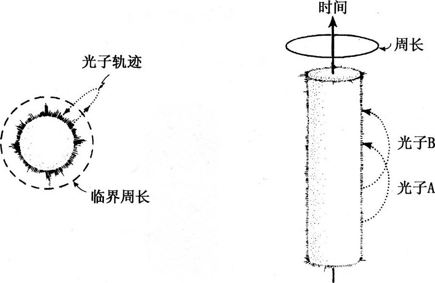 图6.8的左边(空间图,不是时空图)描绘了这样一颗在临界周长内的恒星和从它表面近垂直(径向)发出的光子(光微粒)的空间轨道。向外飞的光子像扔出去的石块,会被恒星引力减速、停止,然后落回恒星。