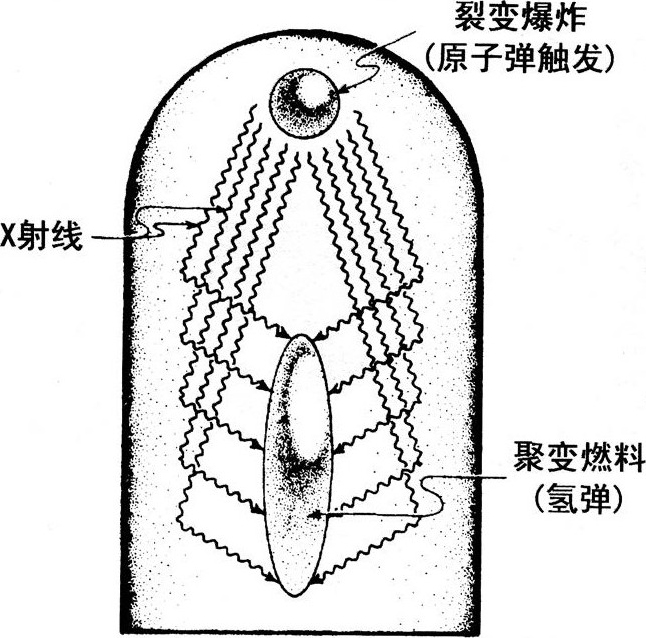 那么,现在我也知道了。我没想过要知道。但结果是不可避免的。特勒—乌拉姆思想一定是用裂变(原子弹)触发器最初产生的X射线来加热、增压,点燃超弹的聚变燃料(图6.5)。80年代,几种解了密的美国出版物证实了这确实是特勒—乌拉姆思想的一部分,要不,我也不会在这儿讲了。
