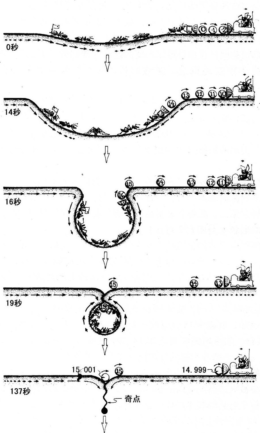 膜的表面将随着塌陷而越来越快地收缩,结果,被陷的蚂蚁等时间间隔发出的信号球要经过越来越长的时间才能被“宇航员”蚂蚁收到(这类似于从坍缩恒星发出的光的红移)。塌陷开始15秒后,发出第15号球,在这同一瞬间,陷落的蚂蚁正好被吸进临界周长。因为临界周长处的膜正好以球的运动速度(光速)收缩,所以第15号球将永远停在那儿。在到达临界周长前0.001秒,陷落的蚂蚁发出第14.999号球(只画在最后一幅图上),这个球勉强比膜的收缩快一点儿,要等到137秒后才能到达宇航员蚂蚁。过了临界周长0.001秒以后发出的15.001号球必然会被吸进高度弯曲的膜区,与那5只陷落的蚂蚁挤在一起。