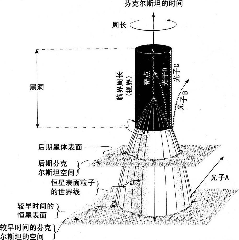 坍缩恒星外的时空几何还是史瓦西的几何,所以能用芬克尔斯坦的新参照系来描述,它与我们以前遇到过的参照系(第1,2章)大不相同。那些参照系(假想实验室)都很小,而且每个参照系的各部分(顶、底、边和中心)都是相对静止的。相反,芬克尔斯坦的参照系很大,可以同时覆盖远离坍缩恒星的时空区域、恒星附近的区域以及它们之间的区域。更重要的是,这些参照系的不同部分是相对运动的。远离恒星的部分是静止的,也就是没有坍缩;而恒星附近的部分则随坍缩的恒星表面向下落。相应地,芬克尔斯坦的参照系同时可以用来描述遥远的静止观察者和随坍缩恒星一起下落的观察者所看到的恒星坍缩过程。结果,这样的描述把从远处观察到的坍缩冻结与从恒星表面观察到的持续坍缩优美地协调起来了。