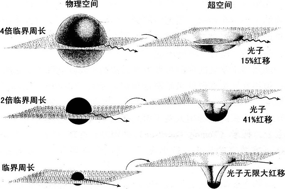 我们在第3章还讨论了从静态恒星表面发出的光的命运。我们知道,因为星体表面的时间比远处的时间流得更慢(引力的时间膨胀),所以在远处接收的来自恒星表面的光将具有被拉长了的振动周期,相应地也就有更大的波长和更红的颜色。光从恒星的强大引力场中往外“爬”时,它的波长将向光谱的红端移动(引力红移)。当静态恒星比临界周长大4倍时,光的波长被拉长了15%(见图右上角的光子);当恒星为2倍临界周长时,红移为41%(中间);当恒星刚好处在临界周长时,光的波长将产生无限红移,意味着光根本没有留下能量,从而也就不存在了。