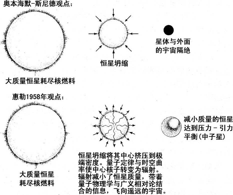 惠勒刚从超弹中解脱出来,就带着这种精神,同哈里森和若野一起填补了我们对冷死星体认识的空白(第5章);他也带着这种精神思考“大质量物体最终命运”的问题。他在这儿遇到了一个他正在寻找的疑惑:没有比2个太阳质量更大的冷死星;然而天空中却有很多质量远比它们大的热星——总有一天会冷却死亡的。奥本海默曾以一贯的直率作风向确立的物理学定律寻求那些星体的行为,(与斯尼德一起)得到一个答案,这似乎令惠勒感到奇怪,也更令惠勒相信,他可能会在这个大质量的命运问题上发现超越20世纪前沿的物理学。我们将在第12、13章看到,惠勒是对的。