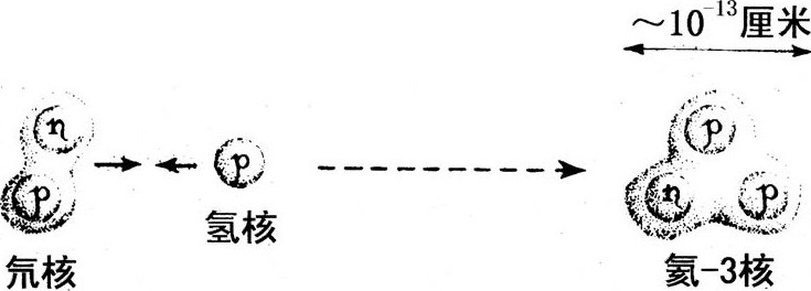 很轻的原子核聚变而形成中间大小的核,放出巨大能量。卡片5.3的一个简单例子是1个氘核(“重氢”,含一个质子和一个中子)和1个普通氢核(单个质子)形成1个氦-3核(两个质子和一个中子)的聚变。