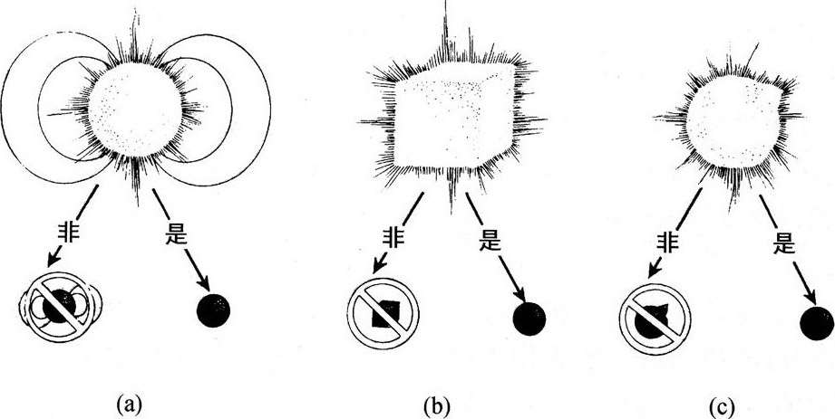 类似的一个诱人的猜想是,如果坍缩的方形恒星要形成黑洞,它的视界也会是圆的而不会有棱角[图7.3(b)]。假如猜想正确,那么黑洞就不会留下什么证据来证明产生它的恒星是方的、圆的或者是有山的,而且(照金兹堡的看法),也不会有证据证明原来的恒星是磁化的还是无磁性的。