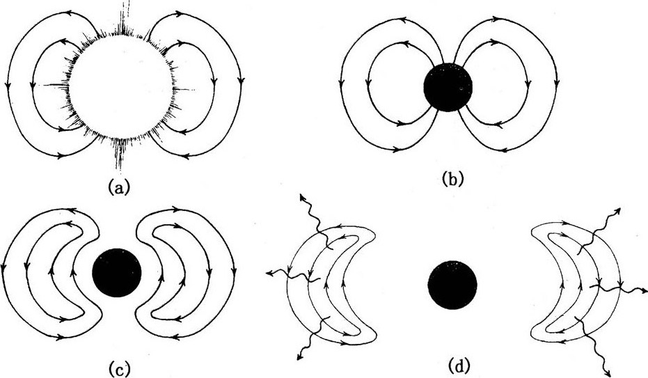 通过计算星体坍缩的全部细节来检验这个猜想,是极端困难的,因此金兹堡走了另一条路,完成了他的第二大发现。他像奥本海默第一次粗略计算恒星坍缩所发生的事情一样,检验了一个静态恒星序列,序列中的恒星一个比一个紧密,而且穿过内部的磁力线数目都一样多。金兹堡认为,这个静态恒星序列应该能够模拟一颗单独的恒星。他导出了描述序列中每颗恒星的磁力线形状的公式,发现了令他大吃一惊的事情。当恒星接近临界周长开始形成包围自己的黑洞时,引力将把磁力线吸到恒星表面,使它紧紧贴在表面上。黑洞形成后,被吸附的磁力线就都落进视界了,没有留下能伸到洞外的[图7.3(a)]。这对金兹堡的类星体动力思想并不是好消息,但确实提出了一种有趣的可能:磁化星体坍缩成黑洞时,黑洞仍然可能像根本没有磁场那样诞生。