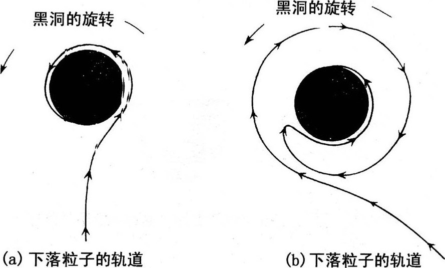 第二个粒子[图7.8(b)]是沿与黑洞旋转方向相反的螺旋轨道落下去的,但当它越来越靠近视界时,还是会被卷进空间旋涡,改变螺旋方向,在外面观测者看来,它也会像第一个粒子那样,被迫跟着视界旋转。