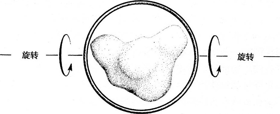 黑洞的旋转除了在空间产生旋涡,还会使视界产生变形,就像地球自转使地球表面产生变形一样。离心力会将旋转的地球赤道相对于两极向外拉出22千米。同样,黑洞的视界的赤道也会因离心力作用而像图7.9画的那样向外凸起。假如黑洞没有旋转,它的视界将是球形的(左图)。假如黑洞旋转很快,凸起就会很大(右图)。
