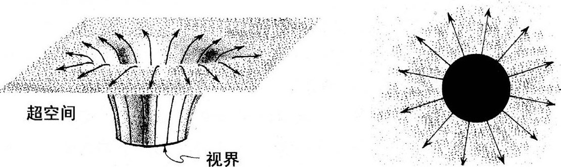 我们可以用嵌入图(图7.6左)来示意带电黑洞周围的空间曲率和黑洞的电力线。这幅图与图3.4的右下图基本相同,不过恒星没有了(图3.4的黑色部分),因为它在黑洞内部而不再和外部宇宙有联系。更严格地说,本图表现了黑洞外嵌在平直三维超曲面中的赤道“平面”——黑洞空间的一个二维碎片。(这个图的意义,请看图3.3和相关正文的讨论。)赤道“平面”是从黑洞视界切下来的,所以我们只能看到黑洞的外头,而看不到里面。视界实际上是一个球面,因为我们只看它的赤道,它在图中看起来就像一个圆。图表现了辐射状指向洞外的电力线。假如从上往下看(图7.6右),我们看不到空间曲率,但确实能把电力线看得更清楚。