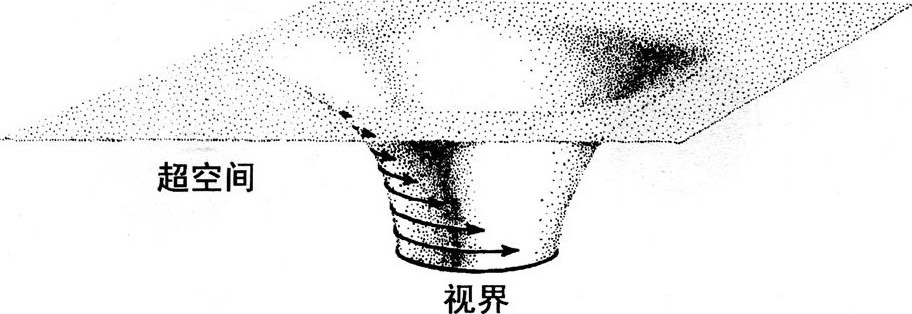 旋涡如图7.7的嵌入图,喇叭形的曲面是嵌在三维平直超曲面内的黑洞的赤道面(黑洞空间的一个二维碎片)。黑洞的旋转抓住它周围的空间(喇叭曲面)像龙卷风一样跟着它旋转,速度与图中箭头的长度成正比。在远离龙卷风中心,空气旋转慢;同样,在远离黑洞视界,空间旋转慢。在龙卷风中心附近,空气旋转快;同样,在黑洞视界附近,空间旋转快。在视界处,空间紧紧附在视界面上,以完全相同的速度跟它旋转。
