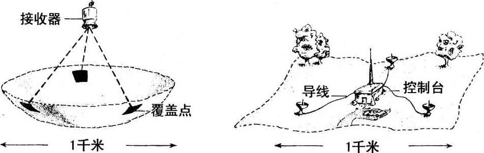 现在,1千米的巨大射电望远镜(图9.2左)多少有点儿像长满了眼睛的脸。望远镜是1千米大的碗,用能将电波反射和聚焦到线阵天线和接收器上的金属片覆盖。如果将各处的金属片拿走,只留下几片散布在碗上,就相当于将多余的眼睛从我们脸上拿走,只留下两只。这两种情形,都不会损失分辨率,只是极大地损失了灵敏度。实验天文学家最需要的是提高分辨率(他们想发现电波从哪儿来,波源是什么形状),而不是提高灵敏度(不需要看到更多更暗的射电源——至少目前不需要)。于是,他们只需要一个斑斑点点的碗,而不需要被完全覆盖的碗。