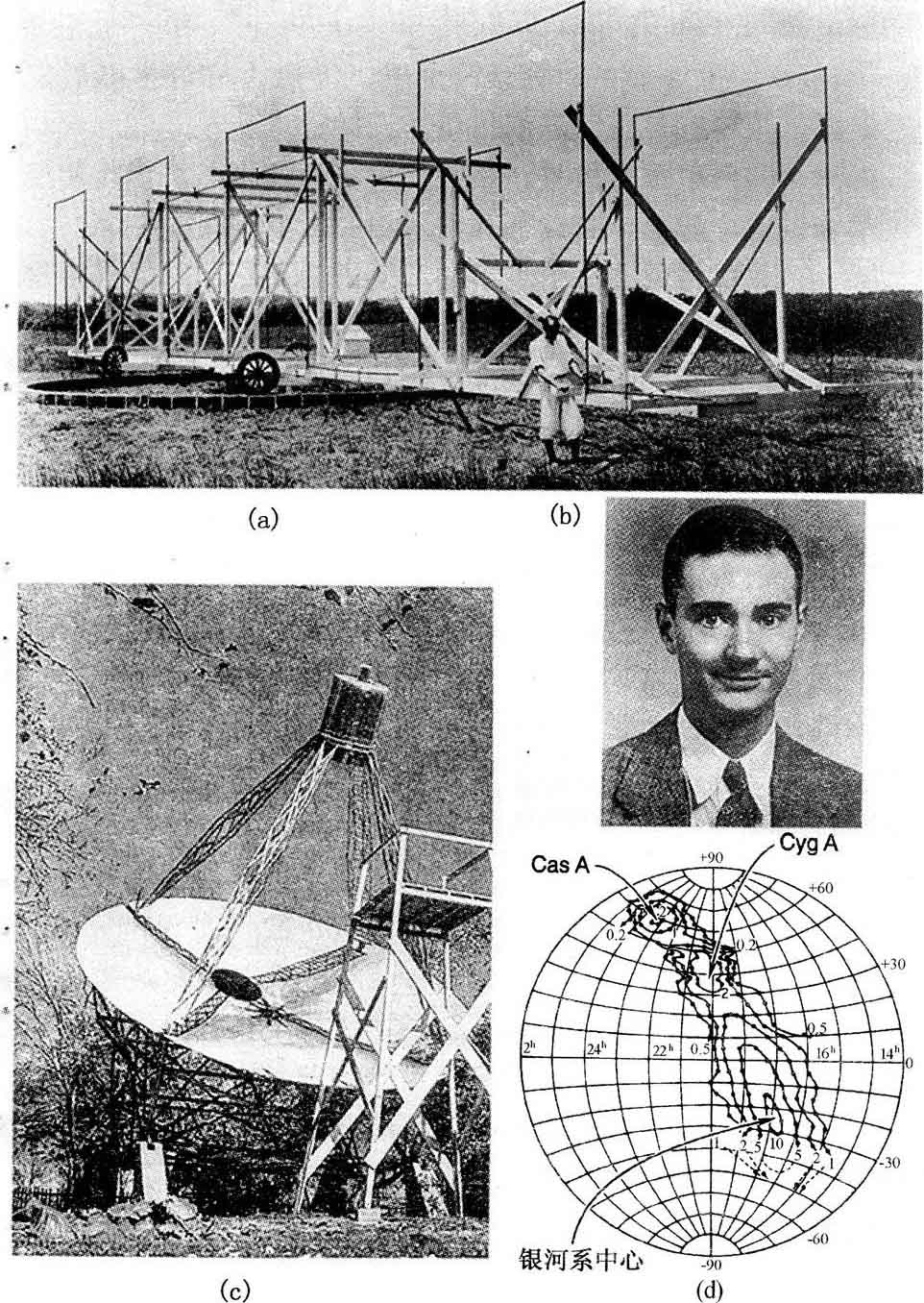 刚从大学出来,央斯基就被派去识别干扰联通欧洲电话的噪音。那个时候,通过大西洋的电话是靠无线电传输的,所以央斯基做了一架由长长的金属管构成的特殊无线电天线,来寻找无线电静电干扰的来源[图9.1(a)]。他很快发现,多数干扰来自雷雨,但雷雨过后还残留有微弱的嘶嘶噪音。到1935年,他已经确定了那噪音的来源,它很可能来自我们银河系的中心区域。当中心区域在头顶时,噪音较强,当它沉到地平线以下时,噪音会减弱,但不会完全消失。