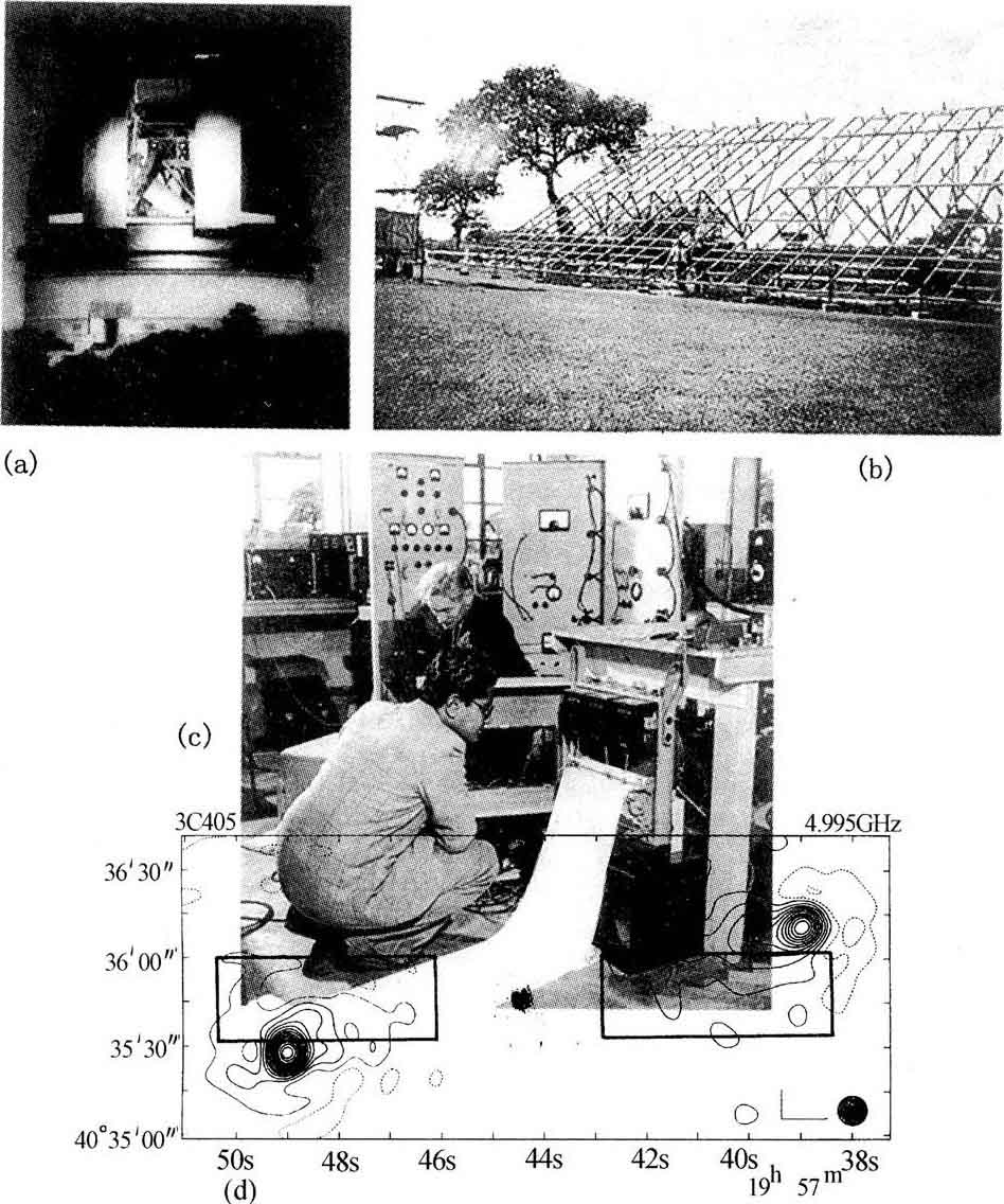 他从《大众天文学》杂志读到央斯基的射电噪音后,就开始研究它的细节。雷伯没受过多少科学教育,但那并不重要,重要的是他有良好的无线电工程训练和强烈的实践精神。凭他巨大的创造力和有限的积蓄,他靠自己的双手在母亲的后院设计制造了世界上第一台射电望远镜,镜面是直径30英尺(也就是9米)的盘子;他用它绘出了天空的射电图[图9.1(d)]。从他的图中可以清楚地看到,射电源除了我们银河系的中心区外还有两个,后来被称为CygA和CasA——A代表“最亮的射电源”,Cyg和Cas分别代表“天鹅座”和“仙后座”(Cassiopeia)。40多年的研究最终证明,天鹅A和许多随后发现的射电源,很可能是由巨黑洞提供能源的。