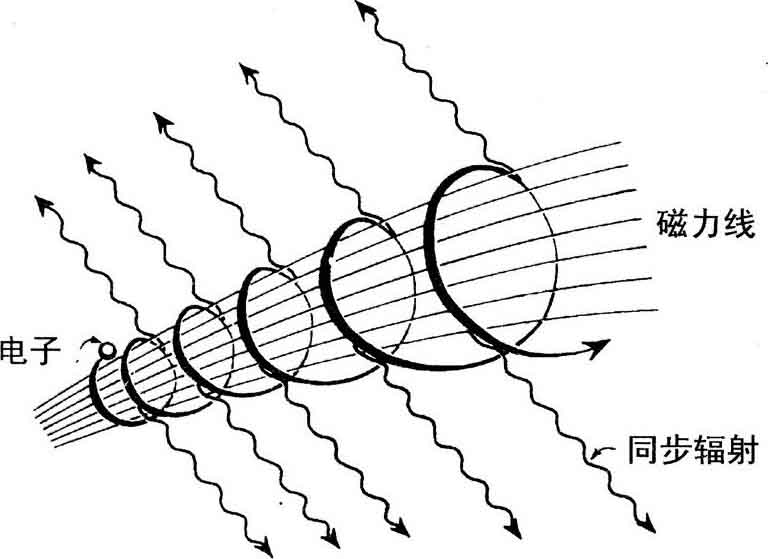 然而,其他途径自20世纪初就已为物理学家所熟悉了:当高速运动的电子遇到磁场时,会因磁力作用而绕磁力线做螺旋运动(图9.4),在螺旋中发出电磁辐射。40年代,物理学家开始将这种辐射称为同步辐射,因为那时正在建造的所谓“同步”粒子加速器里的螺旋电子就产生这种辐射。值得注意的是,尽管物理学家对同步加速器表现了极大的兴趣,天文学家却毫不在意,头脑里的石头阻碍了他们的思想。