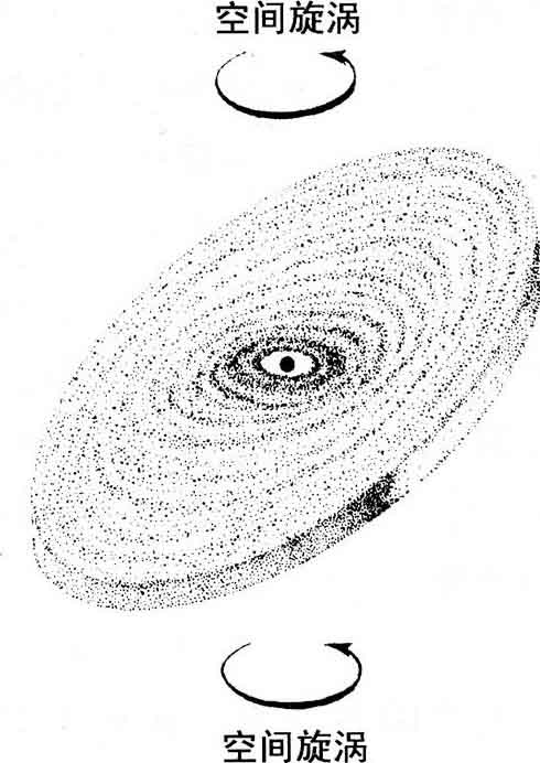 黑洞如果快速旋转,就完全像一只陀螺。它的旋转方向总是严格固定不变的,旋转在黑洞周围产生的空间旋涡(图7.7)也总是指着相同的方向。巴丁和彼德森通过数学计算证明,黑洞附近的空间旋涡一定把握着吸积盘的内部,使它严格保持在黑洞的赤道平面——不论盘的指向与黑洞方向相差多远,都是如此(图9.6)。来自星际空间的气体被盘的遥远外部捕获时,可能会改变那里盘的指向,但由于黑洞的陀螺行为,它不可能改变黑洞附近的吸积盘方向。在黑洞附近,吸积盘总在赤道面上。