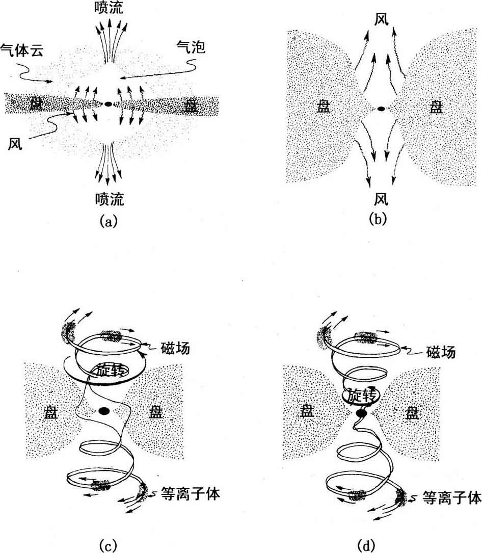 图9.7黑洞和吸积盘激起两股喷流的四种方