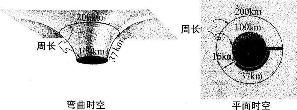 假如黑洞周围的空间本是平直的,而我们因理想尺子是橡皮的而误认为空间是弯曲的,那么真正的空间几何一定像图11.1右图那样,视界和圆之间的真实距离应该是平直的欧几里得几何定律所要求的16千米。然而,广义相对论认为,我们的理想尺子没有测量这一真实距离。拿一把尺子沿着黑洞周长放在视界上(如图11.1右边的带刻度的弯黑宽带),尺子像这样沿着周长方向,的确在测量真实距离。从尺子切出37千米长的一段,它覆盖黑洞周边的37%。然后,将尺子转到半径方向(图上带刻度的直黑宽带)。转向时,广义相对论要求它发生收缩,指到径向时,它的真实长度一定已经收缩到16千米了,刚好从视界到达外面的圆。但是,收缩表面的尺度还是认为它的长是37千米,从而视界与圆之间的距离是37千米。这样,像爱因斯坦那样不知道尺子是橡皮的人会相信这个不准确的测量,认为空间是弯曲的。而像你我这样认识了橡皮特性的人却知道,尺子收缩了,空间还是平直的。