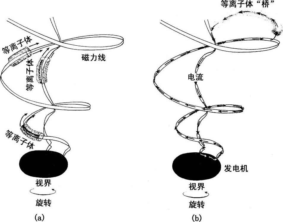 照这点看[图11.4(b)],使等离子体加速并形成喷流的动力是由电路带来的。根据第9章的观点[图11.4(a)],动力则来自飘来飘去的旋转磁力线。两个观点不过是对同一件事情的不同考虑方式。在两种情况下,动力最终来源都是黑洞的旋转。人们可以凭自己的兴趣认为动力来自电路还是来自旋转的磁力线。