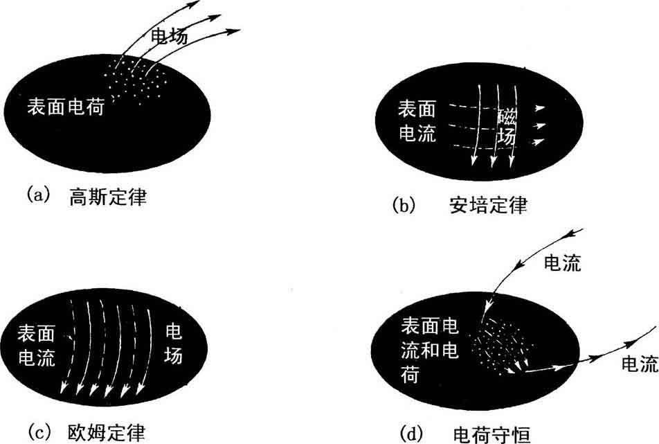 电流到达视界时并没流进黑洞,而是落在视界表面,由汉尼和鲁菲尼以前想象的那种视界电荷携带着。视界的电流从极点流向赤道,在那儿沿磁力线流出来。另外,茨纳耶克和达莫尔还发现,关于黑洞电荷和电流的定律是平直时空中电磁定律(高斯定律、安培定律、欧姆定律和电荷守恒定律)的一种优美表达形式(图11.5)。