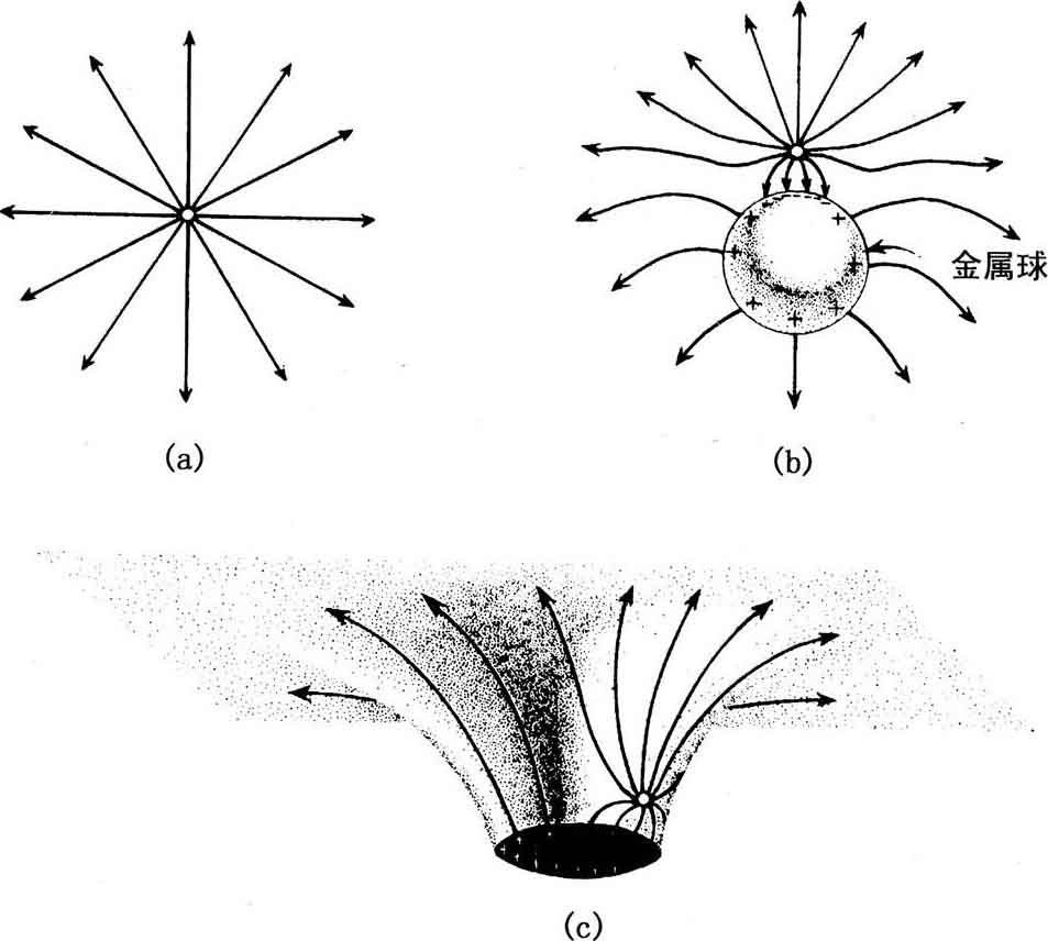 1971年,普林斯顿大学的学生汉尼(Richard Hanni)和博士后鲁菲尼(Remo Ruffini)注意到,黑洞行为多少有些像一个导电球。为理解这种奇特行为,我们想象一个带正电的金属小球,它携带的电场排斥质子而吸引电子。小球的电场可以用类似于磁力线的电力线来刻画。电力线指向场作用在质子上的力的方向(也就是与场作用在电子上的力的方向相反),线密度正比于力的强度。假如小球独立于时空中,它的电力线将径向向外[图11.3(a)]。相应地,作用在质子上的电力也沿径向离开小球。又因为力线的密度随离开小球的距离的平方反比例地减小,所以作用在质子上的电力也随距离的平方而反比例地减弱。