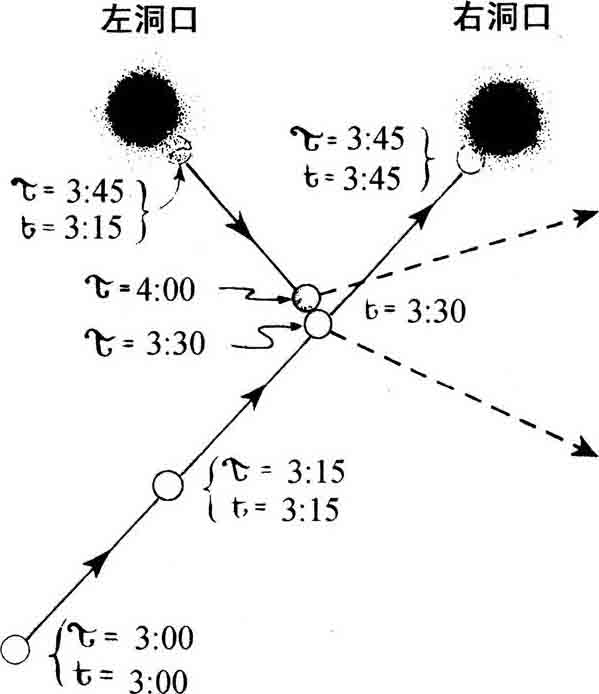 于是,我回到自己的日常生活,一天天、一月月、一年年地等,终于,等到2010年1月1日,卡洛丽远航回来了,降落在门前的草地上。我出去迎接她,看她和预想的一样,只过了12个小时,而不是老了10年。她坐在飞船里,手伸进虫洞,还握着另一个人的手。我站在她身后,从洞里看过去,看到握着她手的那个人是我自己,年轻10岁,正坐在2000年1月1日的房间里。虫洞成了时间机器。假如我现在(2010年1月1日)从飞船的这个洞口爬过去,那么我会在2000年1月1日从屋里的那个洞口出来,与年轻的自己相会。同样,假如年轻的我爬进屋里的洞口,他会在2010年1月1日从飞船的洞口出来。从一个方向穿过虫洞我会年轻10岁;从另一个方向穿过虫洞,我会老10年。