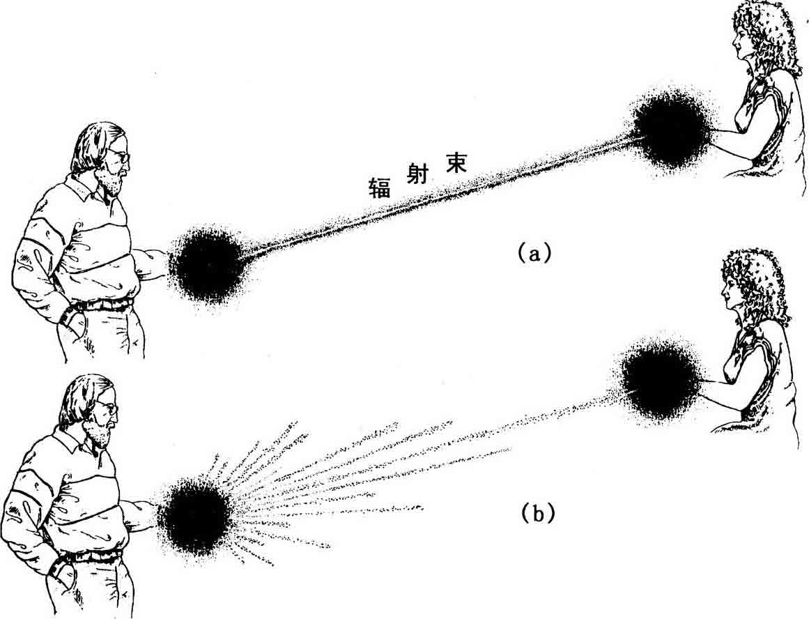 下一次辐射接着从屋里出去,达到飞船,然后从虫洞回来,遇到刚要离开的原先的它,和自己碰在一起,通过多普勒效应增大能量。辐射源源不断地离去,又源源不断地回来,最后变得无限强大〔图14.8(a)〕。