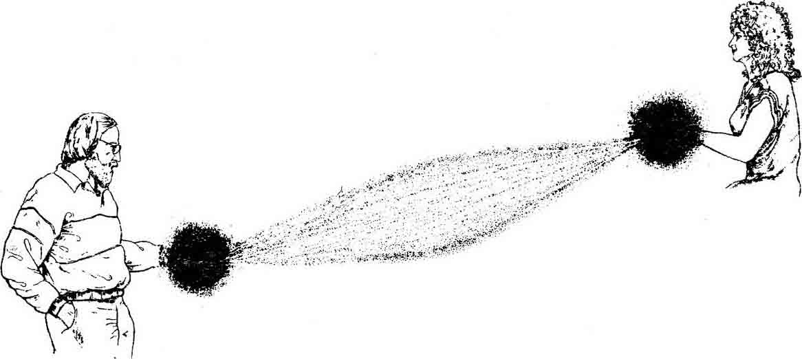 为什么?怎么会呢?我不知道。他们向我解释了。用卡洛丽和我的故事来说,他们解释的大意是:卡洛丽正带着飞船上的洞口飞回地球,我带着另一个洞坐在家里。当飞船离地球在10光年以内时,辐射(电磁波)突然能用虫洞做时间旅行:任何一点离开帕萨迪纳以光速向飞船靠近的随机辐射,10年后到达飞船(从地球上看),进入那儿的洞口,在10年内及时返回(从地球看);当它从地球上的洞口出现时,原先的它刚开始启程,于是,它与它自己碰头了——不仅在空间里,而且在时空里——强度增加了1倍。另外,每个辐射量子(光子)在旅行中还会因为洞口的相对运动而获得能量的提高(“多普勒效应”式的提高)。