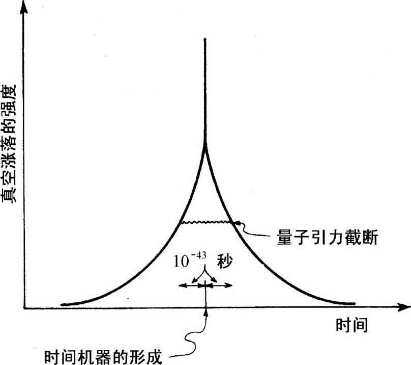 我们的论证是这样的:计算表明,在虫洞中往来的电磁真空涨落,只有在近乎为零的短暂时间里才可能无限强大。它们几乎在第一次能用虫洞做时间旅行的瞬间(也就是在虫洞刚成为时间机器时)达到最高峰,然后立刻消失,见图14.12。