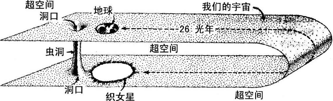 虫洞是宇宙中相距遥远的两点间的一条假想捷径。它有两个洞口,例如,一个在地球附近,另一个在26光年外织女星轨道附近。两个洞口通过超空间的隧道相联结(虫洞),可能只有1千米长。假如我们从地球附近的洞口走进隧道,只经过1千米,就到达另一洞口,出现在(从外面的宇宙看来)26光年远的织女星旁。
