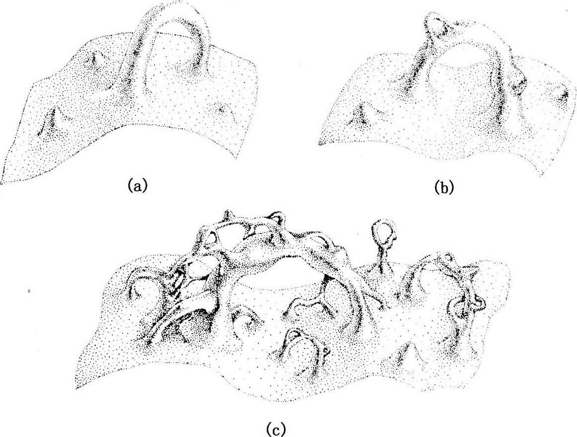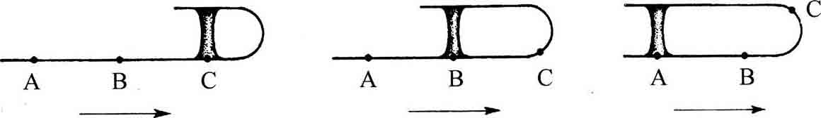 轨道(b)(图14.10右)与(a)相同,不过球的碰撞方式有些不同,相应地,碰撞的路线也有些不同。特别是,从左洞口出来的旧花球的路线与(a)不同,它沿着这条路线将赶到新球的前头(而不是后面),从它的右前缘(而不是左后边缘)轻轻擦过。