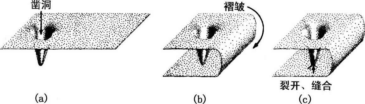 (c)在那个洞的尖端凿一个洞,在洞下面的空间也凿一个洞,然后将两个洞的边缘“缝合”起来,初看时,这个方法是经典的(宏观的),然而,凿开的洞至少会瞬时产生与量子引力定律相关的时空奇点,所以这个方法实际上也是量子的