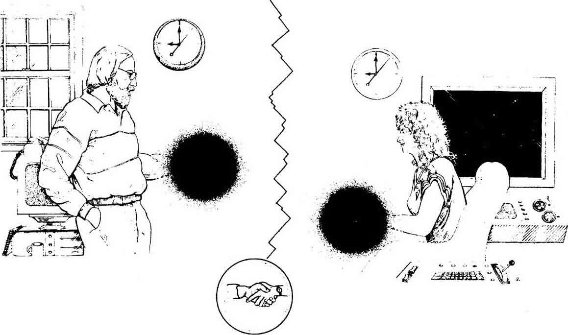 莫里斯和尤泽维尔是通过电脑网络和电话跟我联系的,因为我还一个人躲在小屋里,卡洛丽在威斯康星的麦迪逊做为期两年的博士后工作,头7个月(1988年1月~7月)我跟着她,成了她的“男保姆”。我们在麦迪逊租了房子,我把电脑和书桌搬进小阁楼里,多数时间就待在那儿思考、计算、写作——主要是为了别的项目,也有部分是关于虫洞和时间的。