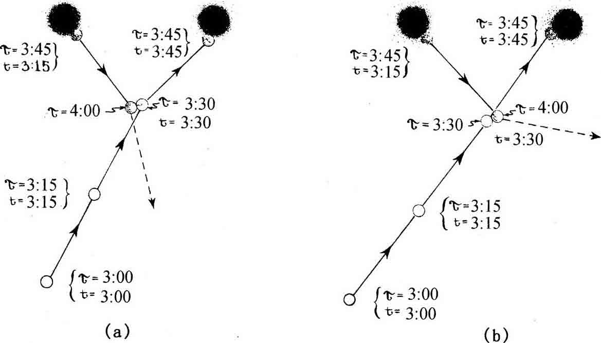 在轨道(a)(图14.10左),一只新白球从下午t=3:00出发,沿着与波尔琴斯基怪圈完全相同的路线(图14.9)向着右边的洞口运动。半小时后,t=3:30时,这只新的白球被一只看起来旧一些的花球(我们将看到,它是那只球未来的自己)撞在左后边缘。碰撞很轻,新球只稍微偏离了原来的路线,但白球还是被撞成了花球。这只新的花球继续沿着偏离的路线运动,在t=3:45时进入虫洞口,回到30分钟以前,在t=3:15时从另一洞口出来。由于路线与波尔琴斯基怪圈的相比发生了偏转,从虫洞出来的变旧了的花球在t=3:30时从它原来自己的左后边缘轻轻擦过,而不像图14.9那样发生强烈的碰撞和巨大的偏转。这样,球的经历是完全自洽的。