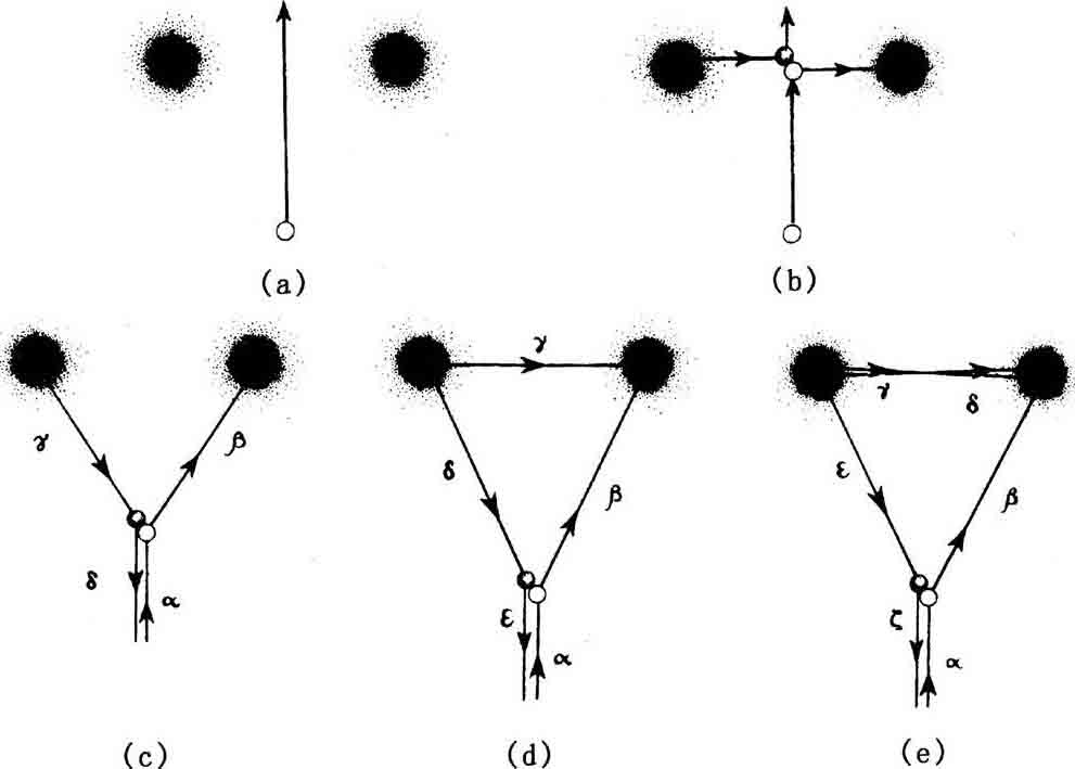 即下面的轨道(c):碰撞不是发生在两洞口间,而发生在球到达洞口邻近以前。我后来发现,假如球在经历两次碰撞事件之间多次穿过虫洞,那么碰撞还可以越来越早地发生,如(d)和(e)。具体说,在(e)的情形,球沿路线α向上,与它未来的自己碰撞,沿着β进入右洞口,然后穿过虫洞(回到过去),从左洞口出来,又沿γ穿过虫洞(回到更远的过去),然后沿δ再穿过虫洞(回到更更远的过去),从ε出来,去与它自己碰撞,偏向ζ落下。