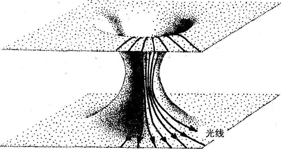 这与引力透镜发生的事情正好相反(图8.2)。在那儿来自遥远恒星的光被途中的恒星或星系或黑洞的引力所吸引、聚焦;在这里,光却被散焦了。