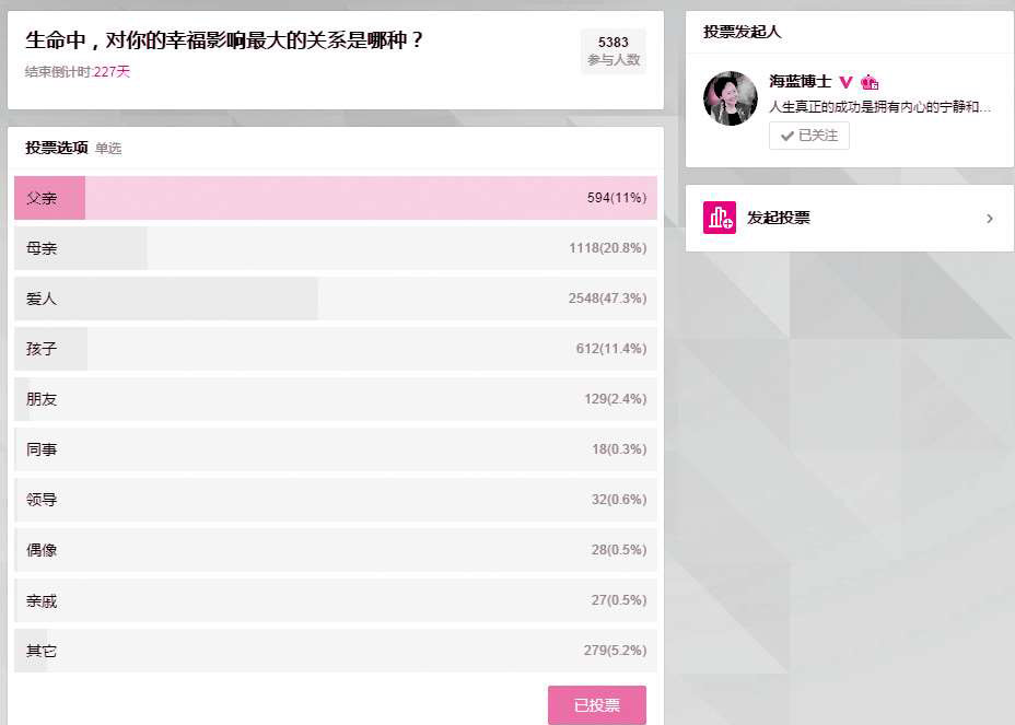 我们曾经在微博上做过一个调查:人的一生当中,哪些关系对自己幸福的影响最大?超过50%的人认为,与爱人的关系对一生的幸福影响最大。