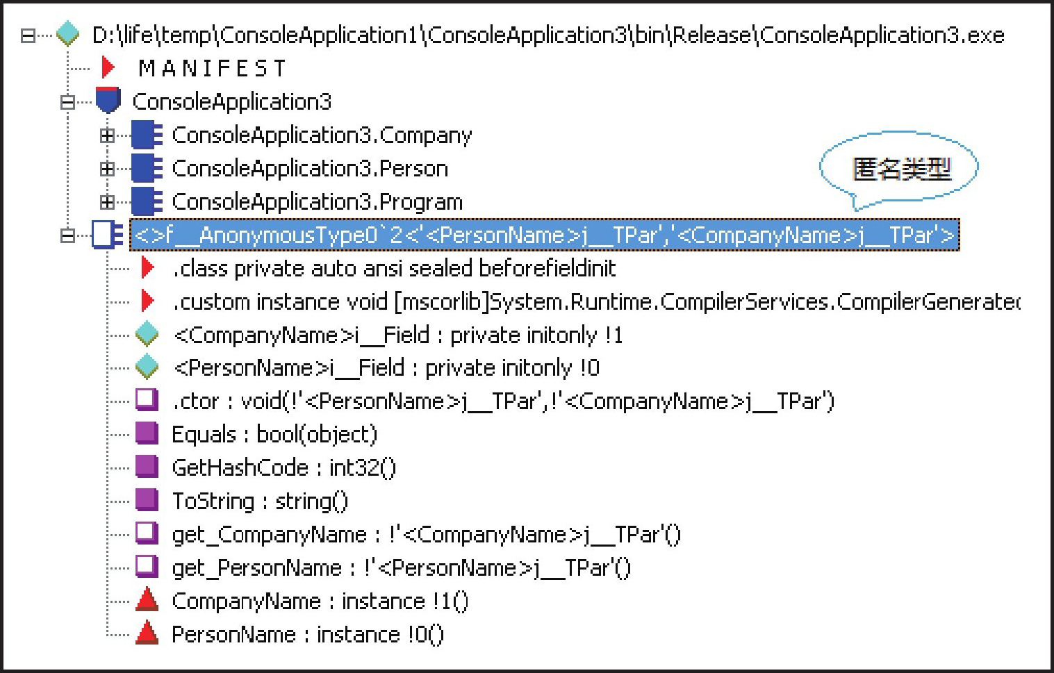 匿名类型也派生自Object,查看上面代码的IL代码我们知道,匿名类型会在IL中发出一个类(也称为一个投影),如图2-6所示。