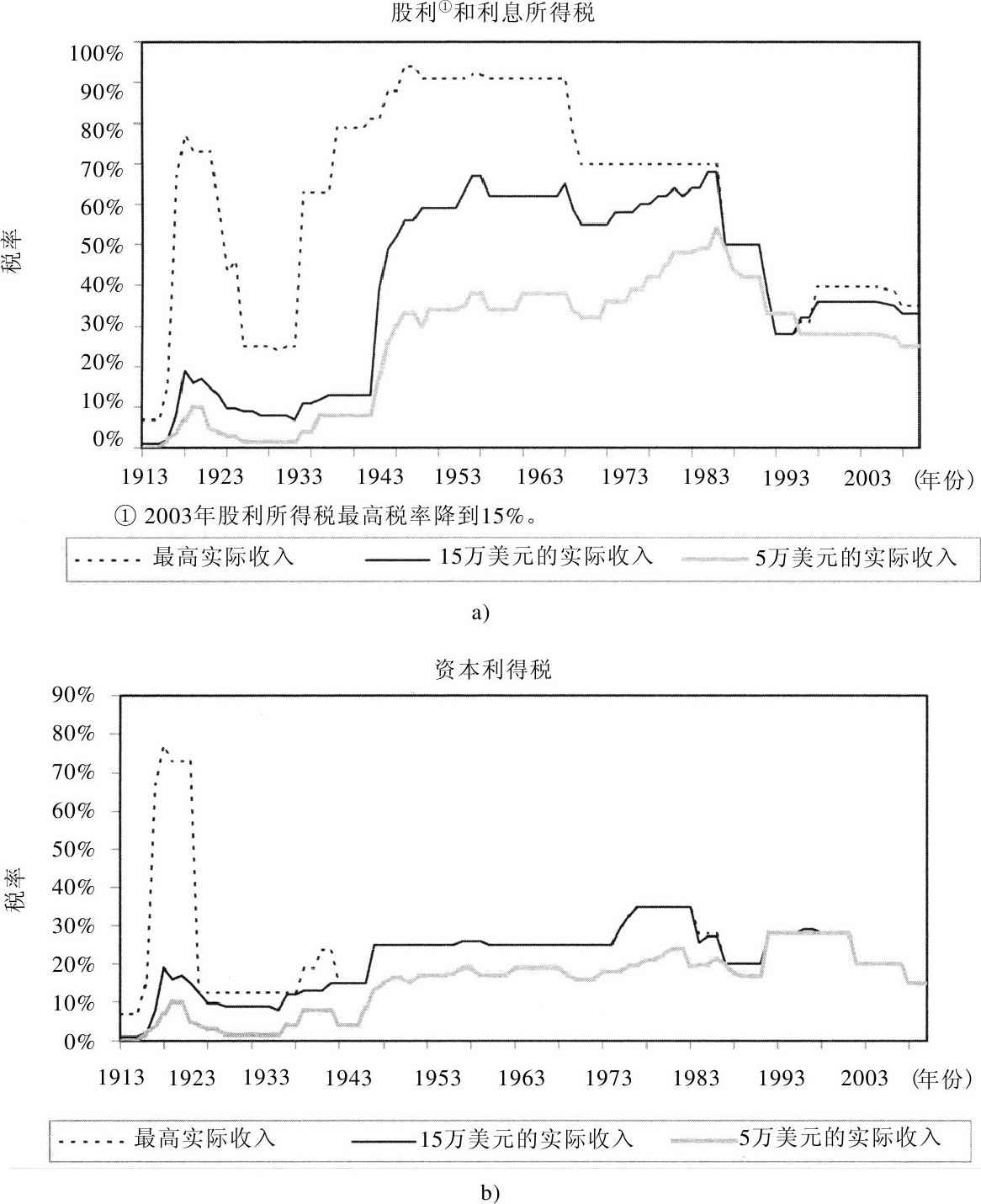 资本利得税从1978年最高的35%降到了2003年的15%。2003年以前,当股利所得税从普通所得税中分离出来时,股利所得税的变动范围为战后中期的90%到1998年的30%,最后变为2003年的15%(参见本章附录税则的历史演进)。