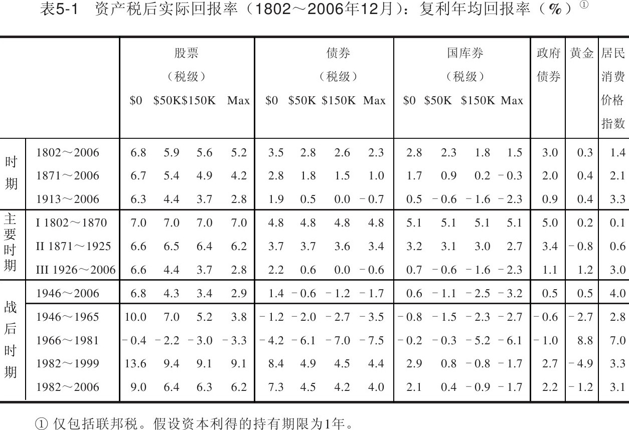 表5-1列出了4个税级下税后实际总体回报率的历史数据。自1913年征收联邦所得税开始,股票的税后实际总体回报率区间就从免税投资者的6.3%到应税投资者的2.8%不等。而在不同税级下,应纳税债券的实际年均回报率从1.9%~-0.7%不等,国库券实际回报率区间则从0.5%~-2.3%。自从征收所得税以来,政府债券的实际年均回报率就为0.9%。