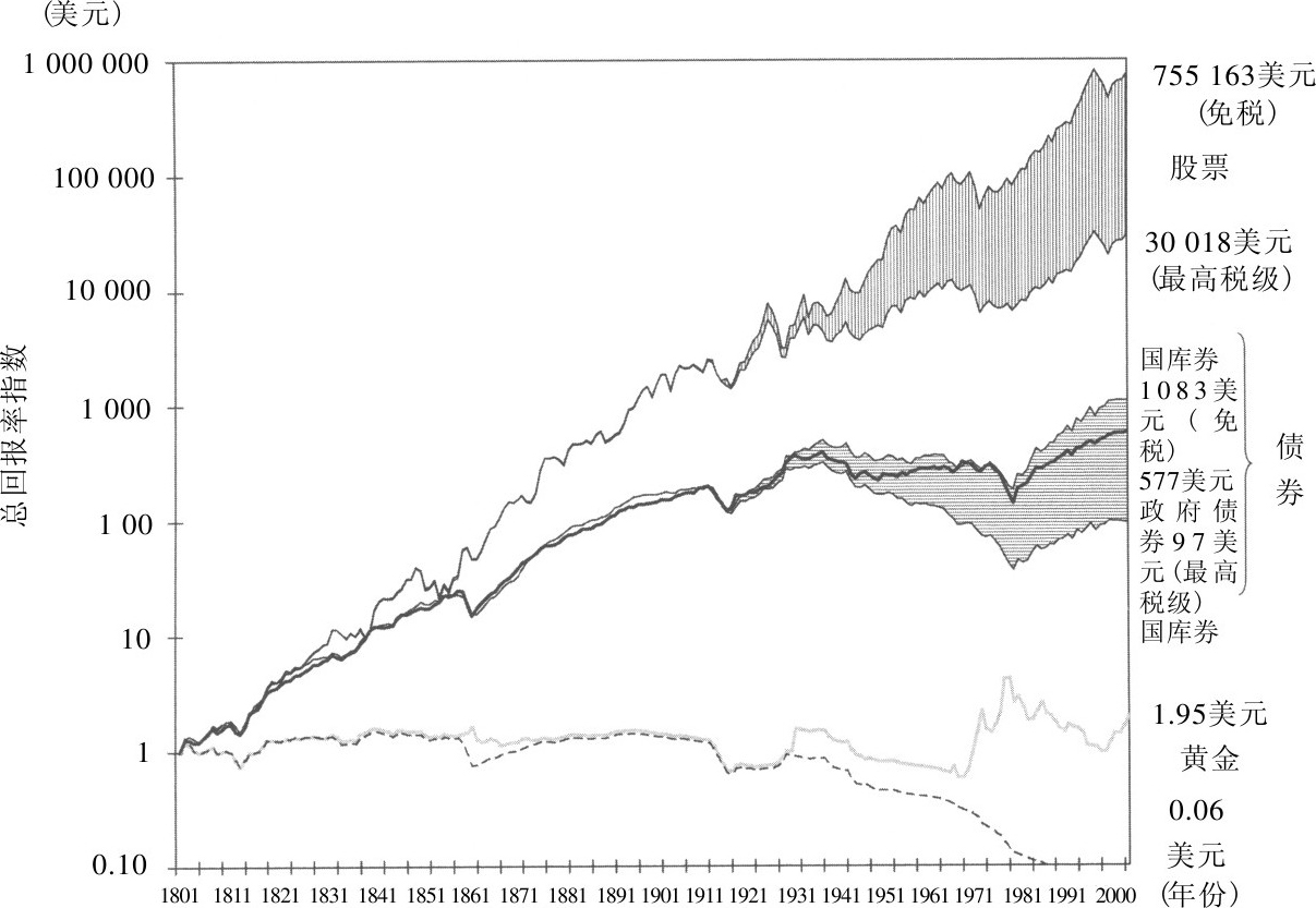 我们已经在第1章的图1-4中列出了股票、债券、国库券和黄金的实际总体回报率指数。而图5-2描述的则是税收对这些回报率的影响。