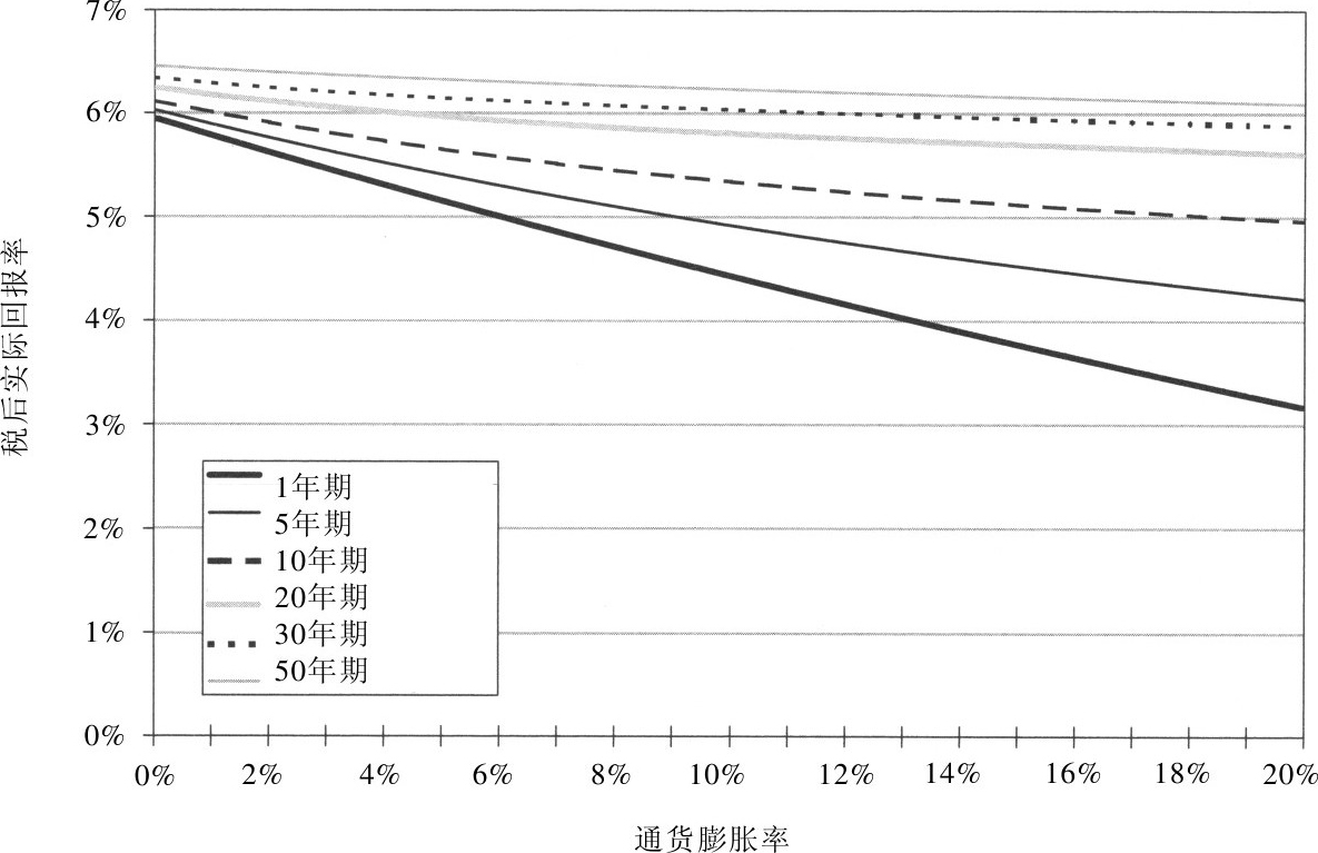 当持有年限较短时,通货膨胀税对税后实际回报率的影响要大得多。因为投资者买卖资产的频率越高,政府对资本利得征税的机会就越多。但是即使是对于那些长期投资者,通货膨胀税也会减少其税后回报率。
