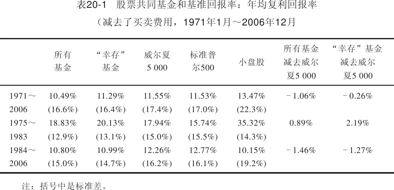 表20-1列出了两种方法计算的所有结果。从1971年1月到2006年12月,股票共同基金的年均回报率为10.49%,比威尔夏5 000指数回报率低1.06%,比标准普尔500指数回报率低1.04%。事实上,这些幸存的基金的回报率每年的增长幅度已经达到了0.8%,但是仍然低于市场平均水平。排除了买卖费用之后更是会减少投资者的净收益。