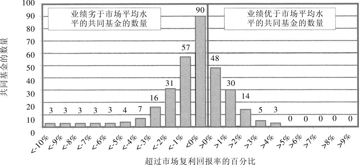 共同基金业绩下滑始于20世纪70年代。1970年,贝克尔证券公司整理编纂的养老金基金经理人记录让整个华尔街都震惊了。贝克尔公司的统计数据证明,共同基金经理人的年平均收益比标准普尔500指数收益低1%,而且仅有1/4的经理人业绩高于市场平均水平。