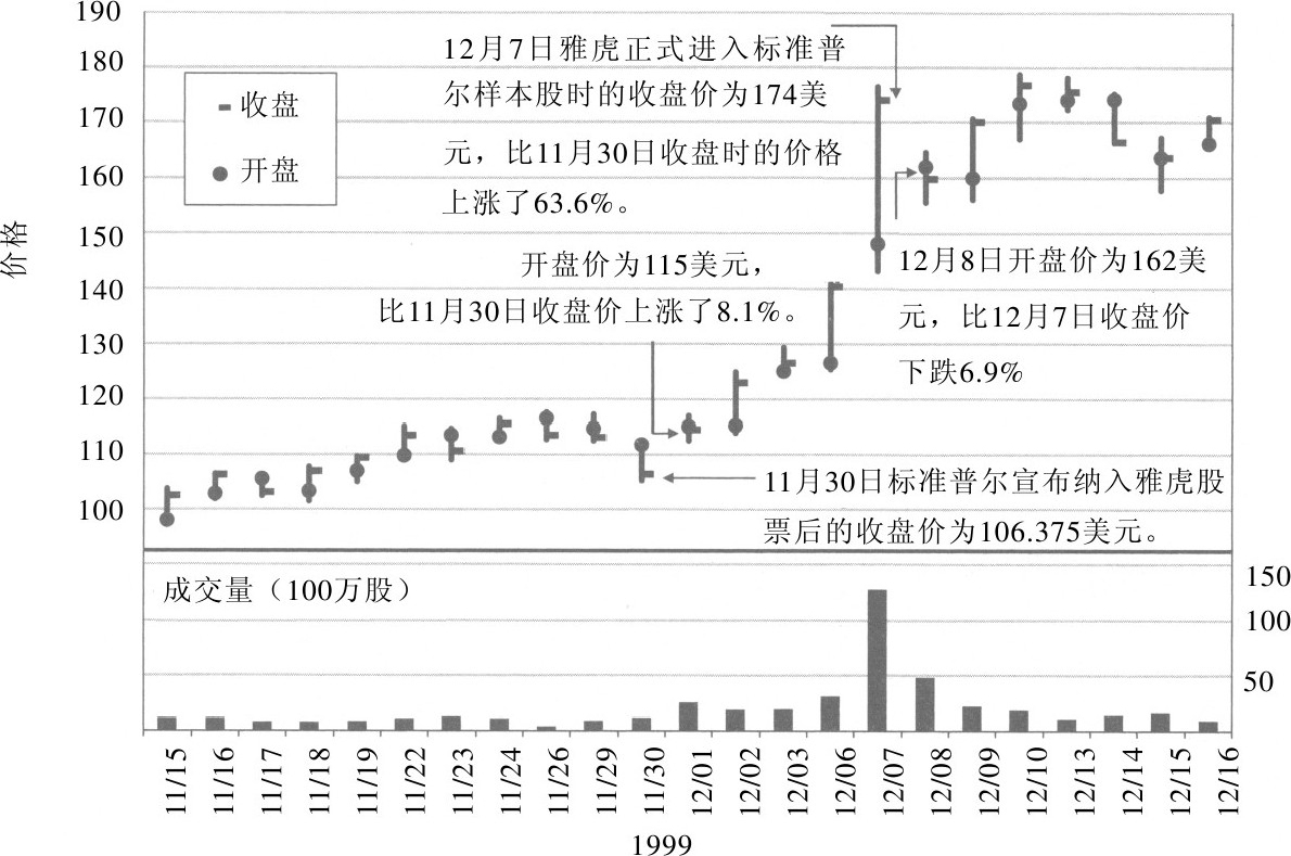 股价被高估的一个极端例子是著名的网络公司雅虎。1999年12月,雅虎公司成为标准普尔500的样本公司,图20-3反映了雅虎股票在这段时间内的变化情况。标准普尔在1999年11月30日交易结束后,正式宣布将在12月8日把雅虎纳入计算范围。第二天上午,雅虎股票一开盘就涨了约9美元,股价达到115美元,并在之后的几天内持续上涨,截至12月7日,股价达到174美元。而指数基金为了能够与指数相对应,必须在12月7日那天买入雅虎的股票。这只股票从宣布进入标准普尔500到正式进入只经历了5个交易日,在这短短5天时间内,股价飙升了64%,平均成交量也达到3 700万股,比前30天交易量的3倍还多。12月7日,当指数基金正式买入雅虎股票时,其成交量达到1 320万股,价值220亿美元。