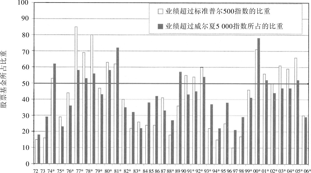 图20-1显示了在1972~2006年间,一般股票基金业绩超过威尔夏5 000和标准普尔500指数所占的比重。在这35年间,大多数共同基金业绩只有11年超过了威尔夏5 000,而这11年中有9年时间,小盘股表现优于大盘股。过去25年来,股票共同基金只在5年的时间里平均业绩优于市场平均水平。